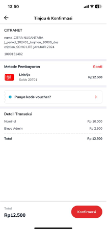 5. Jika nominal sudah sesuai, tap "Konfirmasi" dan tunggu sesaat lalu masukkan PIN LinkAJA