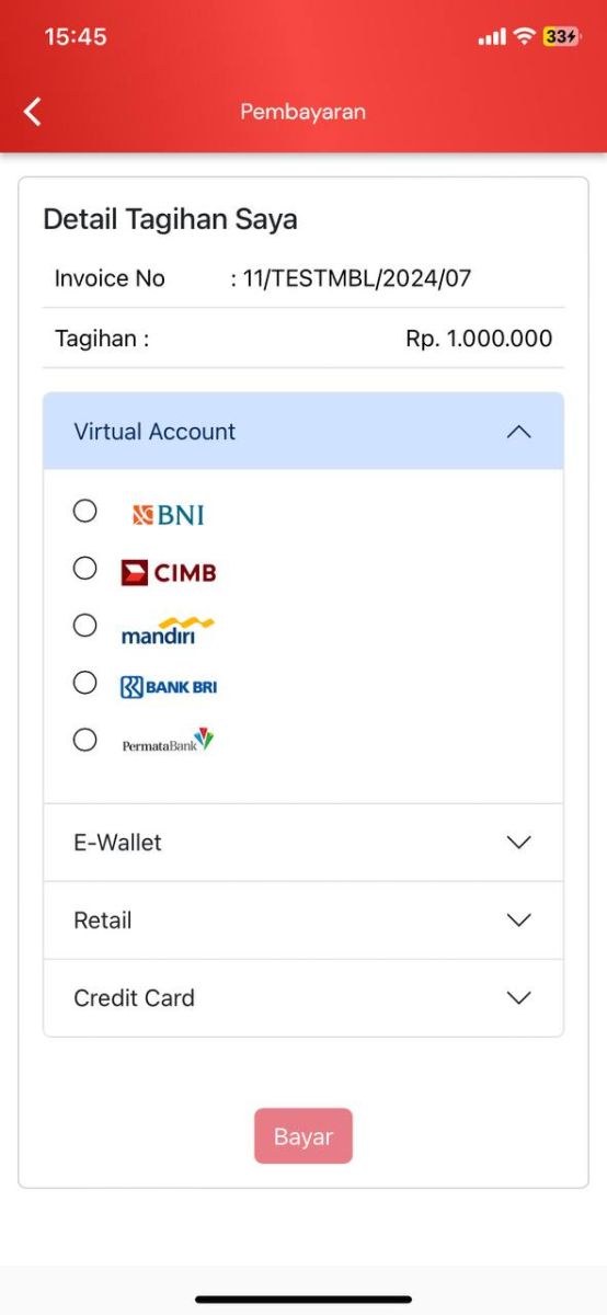 - Virtual Account: Bank BNI, CIMB Niaga, Bank Mandiri, Bank BRI, Permata Bank