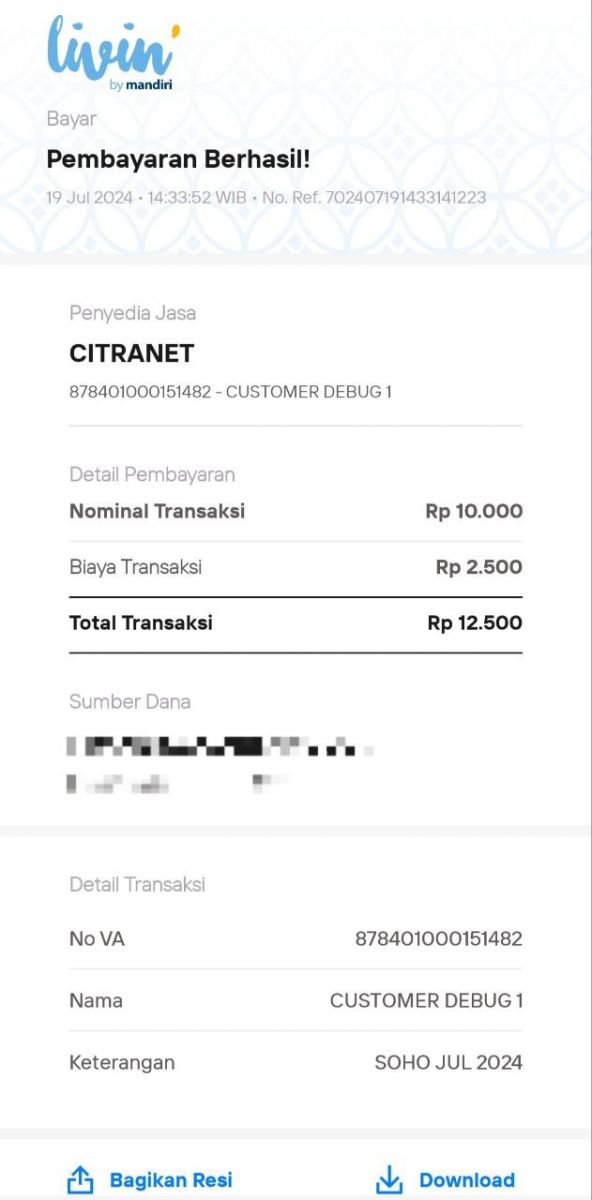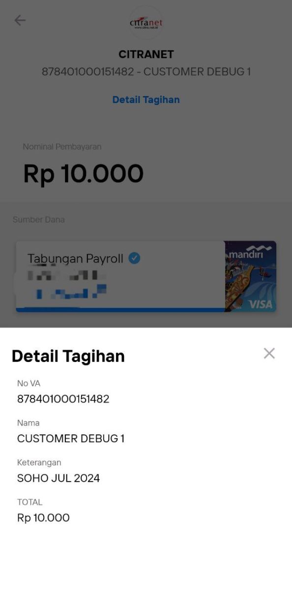 Virtual Account (VA) Mandiri adalah nomor rekening virtual yang disediakan oleh bank Mandiri untuk proses pembayaran tagihan bulanan bagi setiap pelanggan CITRANET.