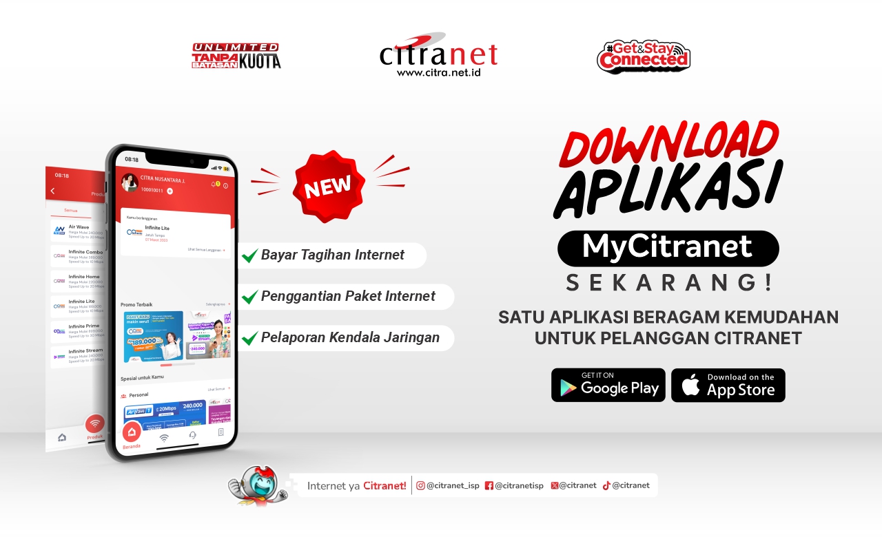 Demi meningkatkan kualitas layanan dengan memberikan beragam akses kemudahan bagi pelanggan, CITRANET resmi merilis aplikasi mobile MyCitranet ke publik pada hari ini. Pelanggan CITRANET kini sudah dapat mengunduh aplikasi mobile MyCitranet lewat Google Play Store atau Apple App Store. Melalui aplikasi MyCitranet, pelanggan dapat menikmati beragam fitur dan layanan dari smartphone yang dimiliki. Beberapa fitur dan layanan diantaranya adalah pembayaran tagihan bulanan melalui berbagai merchant, request penggatian paket layanan, informasi promo dan paket terbaru serta pelaporan gangguan internet melalui email maupun Whatsapp resmi CITRANET.