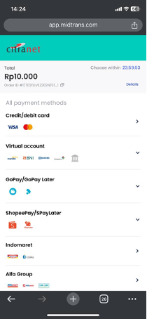 - Virtual Account: Bank BNI, CIMB Niaga, Bank Mandiri, Bank BRI, Permata Bank